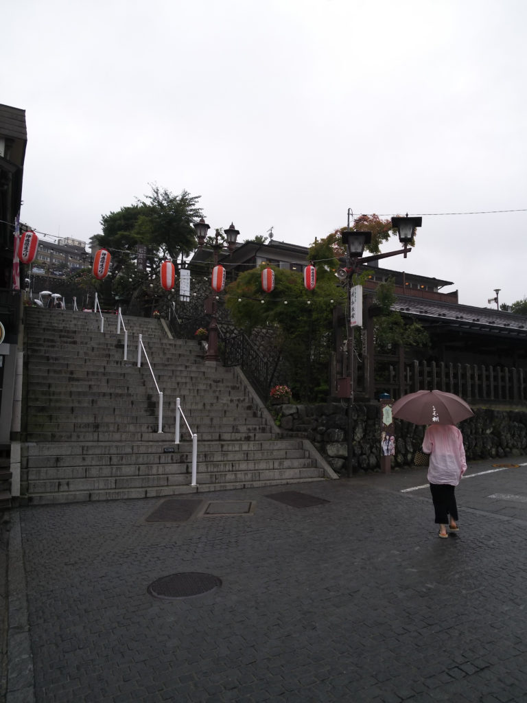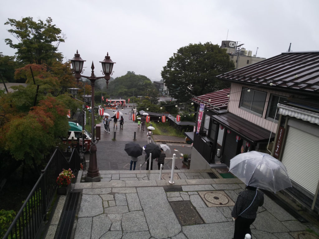 無事お部屋に入れたので、夕食までの時間にあたりを散策してみることにしました。伊香保温泉は石段街とよばれる365段にも及ぶ階段の両側にお店が並び、一番上には伊香保神社があることで広く知られています。周囲には物資を運搬するための道路もありますが、観光を楽しむにはこの石段を昇り降りするしか選択肢がありません。夏にはじわりと汗をかきますので入浴前の散策がお勧めです。