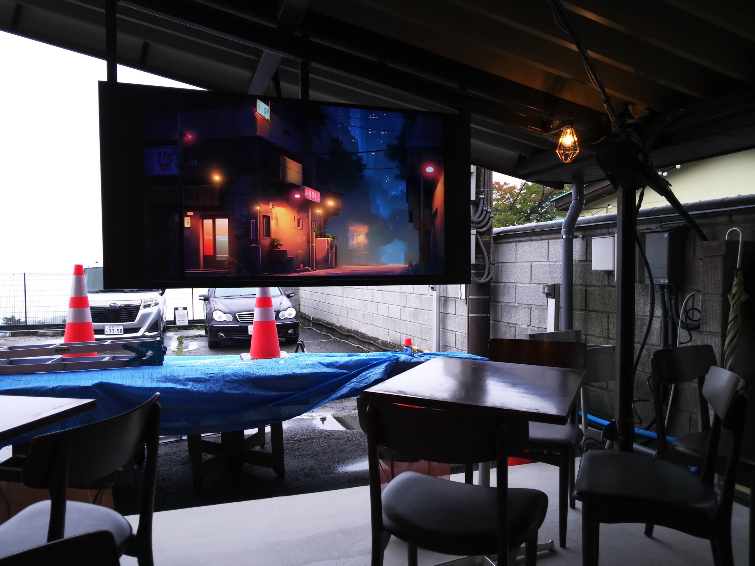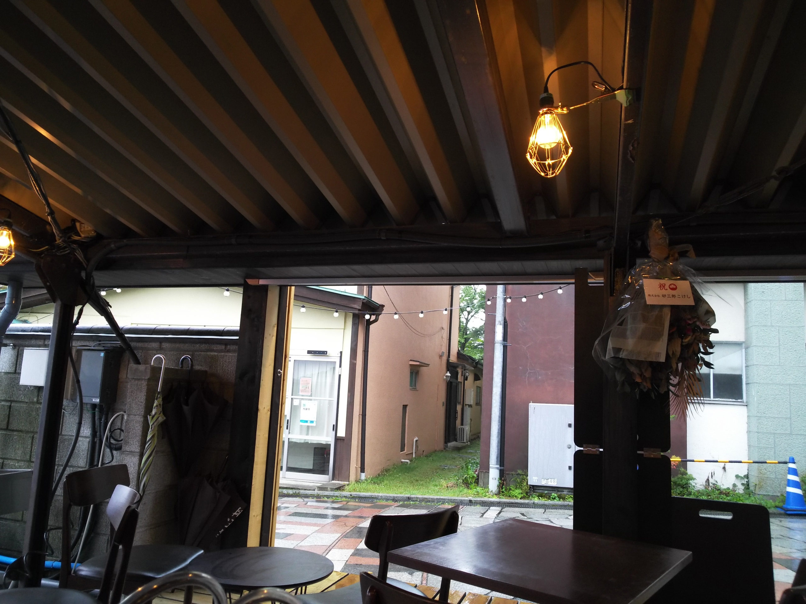 店内には大きなモニタに環境ビデオが流れていて、雨音を聞きながら落ち着いた雰囲気を楽しむことができます。後ろの駐車場が丸見えでなかったらもっとよかったですね。それでも、泥臭い温泉街とは一線を画したお店です。
